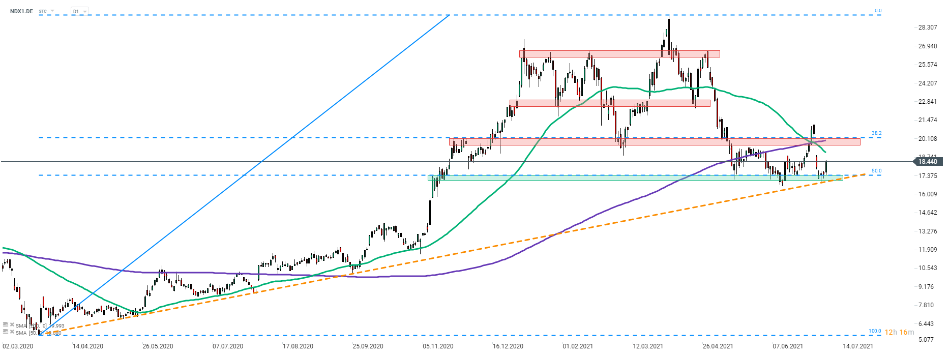 Nordex (NDX1.DE) trades higher today, following news on a contract in Australia. Stock bounced off the support zone marked with the 50% retracement and the upward trendline. The nearest key resistance to watch can be found in the area marked with 38.2% retracement of the upward move launched in March 2020 (€20.25). Source: xStation5