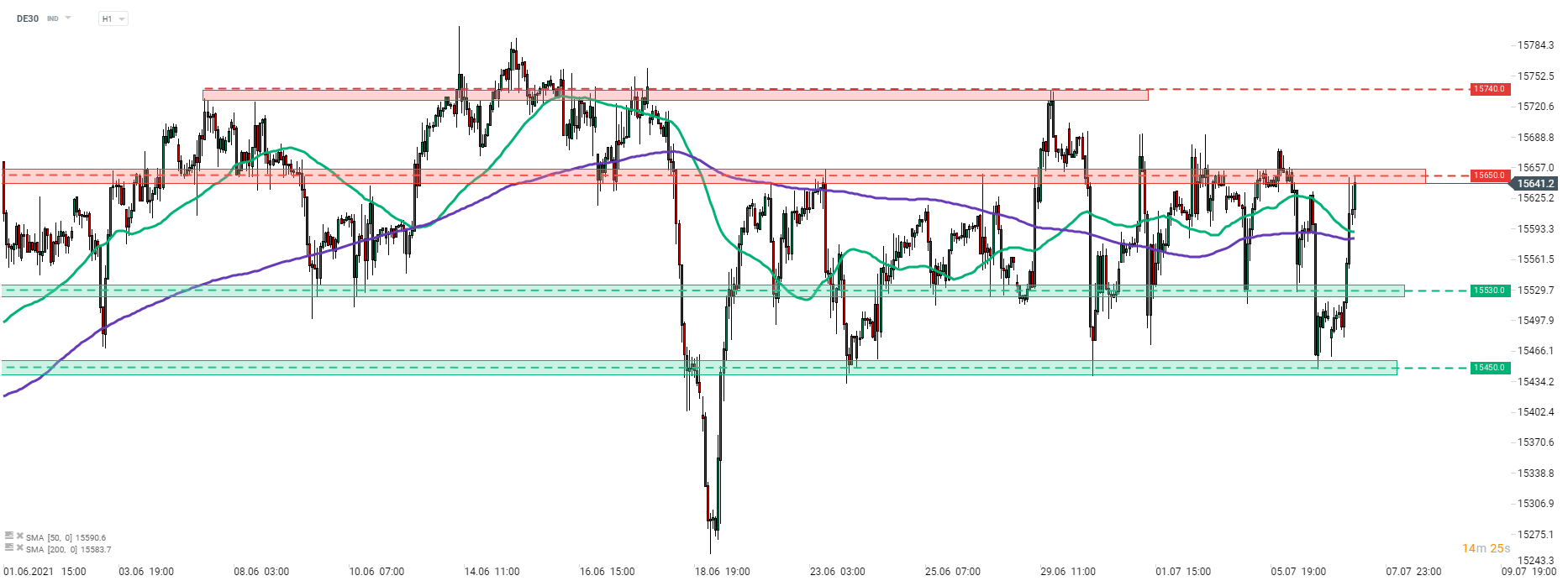 DE30 experienced steep downward moves shortly after opening of the European cash session in recent days. However, this time the German index has managed to snap a streak and investors could observe a large jump at the beginning of the European session and shortly before it. There was no news that could justify this jump. Having said that, it looks like the index continued to play out technical trading range. DE30 bounced off the lower limit of the range in the 15,450 pts area and moved towards the upper limit at around 15,650 pts. While the initial attempt of breaking above failed, the index continues to trade near the upper limit. In case of a break high, attention will shift to the resistance zone at 15,740 pts. Traders should keep in mind that lack of major data releases may lead to a slightly muted session. However, things are about to get more interesting in the evening with the FOMC minutes release scheduled for 7:00 pm BST.