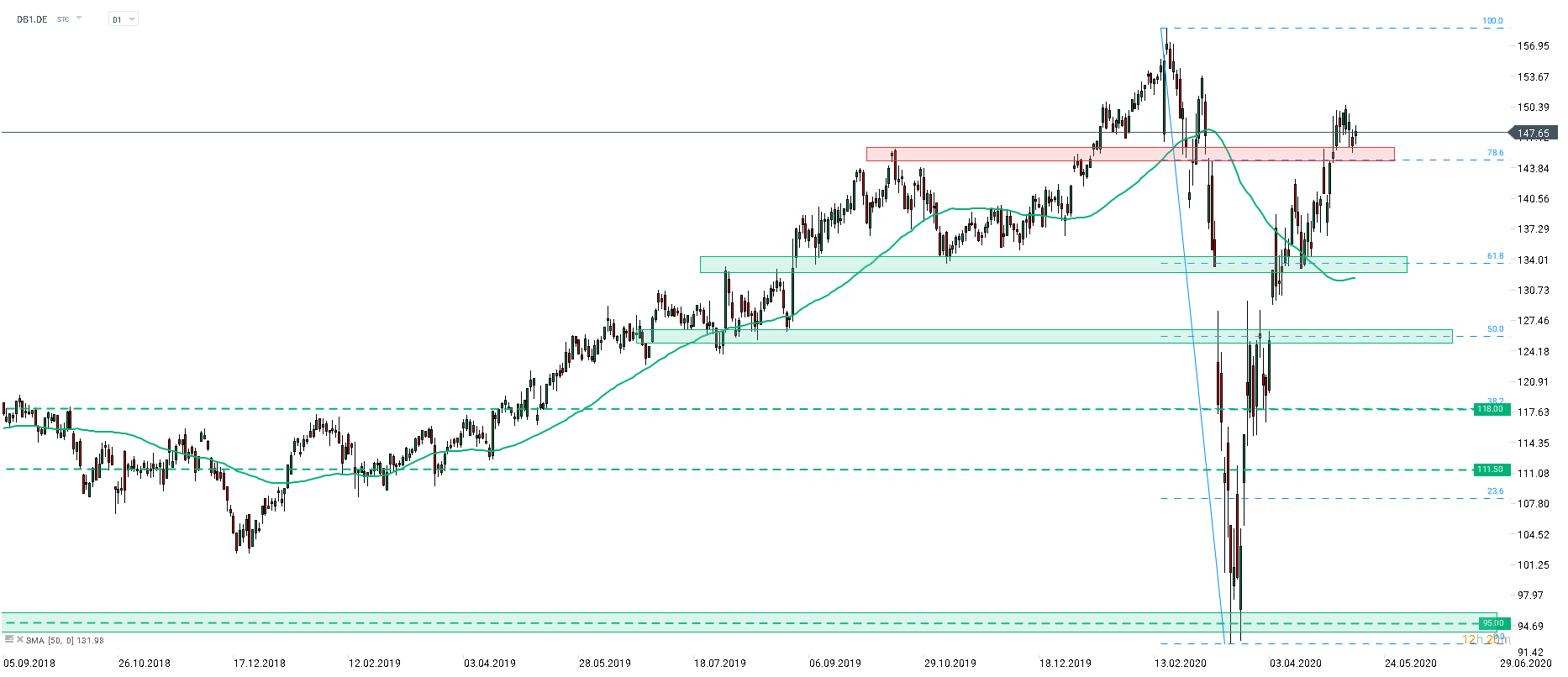 Deutsche Boerse (DB1.DE) made a retest of a support zone ranging above the 78.6% Fibo retracement of February-March drop. The stock is trading higher today and could be gearing up for a bigger upward impulse. In such a scenario, traders may expect some resistance to arise above €155 (ATH area). Source: xStation5
