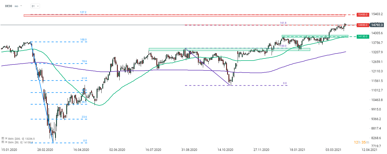 DE30 reached a fresh all-time high on Friday during the after-hours trading. Index launched a new week lower and slipped back below the 14,800 pts handle. Taking a look at DE30 from a broad perspective, we can see that this zone is marked with the 161.8% exterior retracement of the downward correction from September-November 2020. Failure to make a meaningful break above it may lead to a pullback. In such a scenario, the nearest key support to watch can be found at 14,130 pts. On the other hand, if upbeat moods continue and DE30 breaks above 14,800 pts, bulls should focus on the resistance at 15,400 pts, marked with 127.2% exterior retracement of early-2020 pandemic drop. Traders should keep in mind that as Easter holiday approaches, liquidity may be slightly thinner this week.