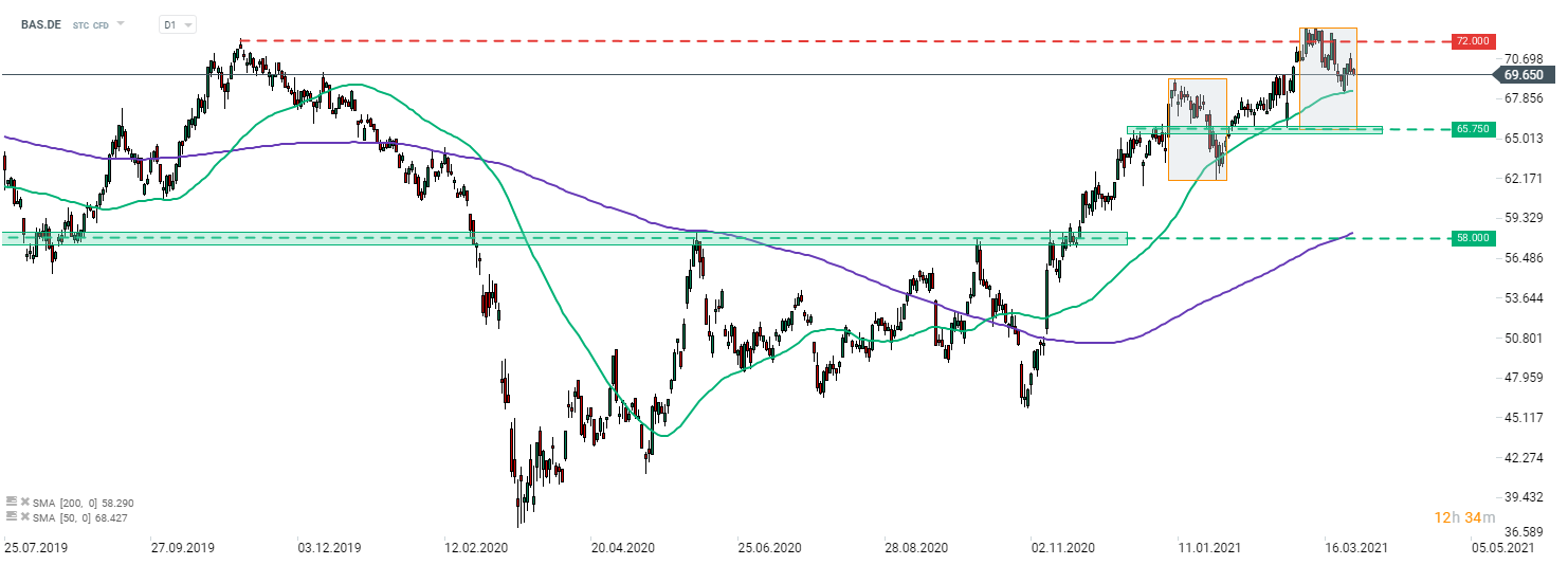 Share price of BASF (BAS.DE) managed to break above the November 2019 peak at €72 at the beginning of March. Nevertheless bulls failed to hold onto these gains for long as the price pulled back recently. It looks like the stock has found a support at 50-session moving average (green line). However, if the downward move is resumed, a key near-term support can be found at the lower limit of the market geometry (€65.75). Source: xStation5