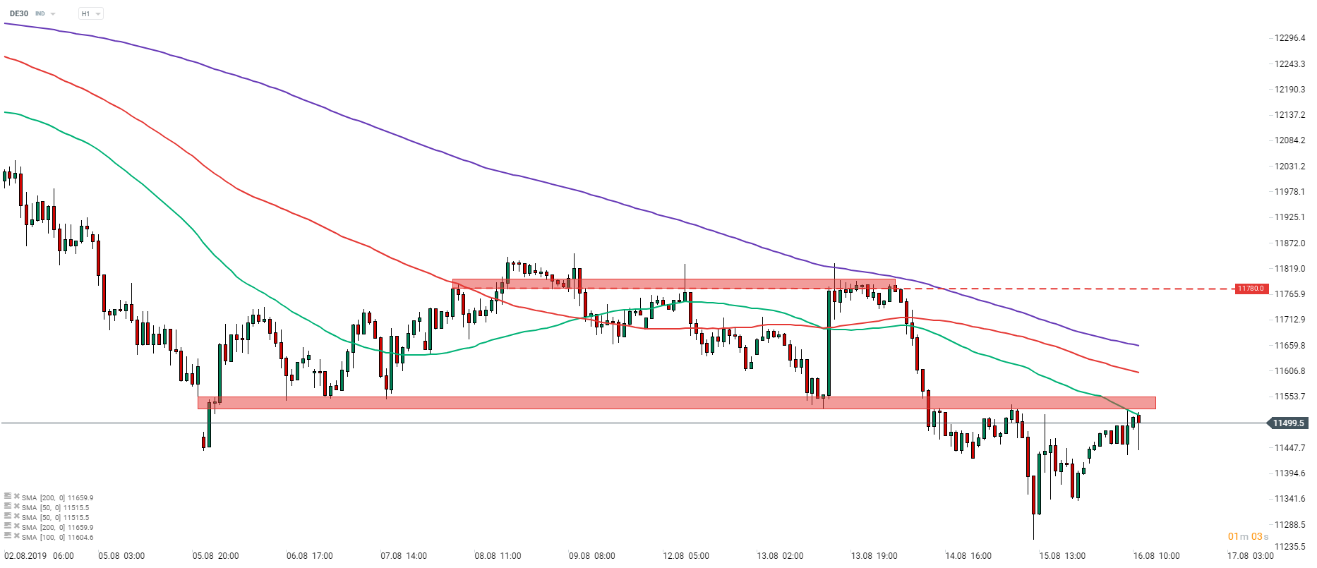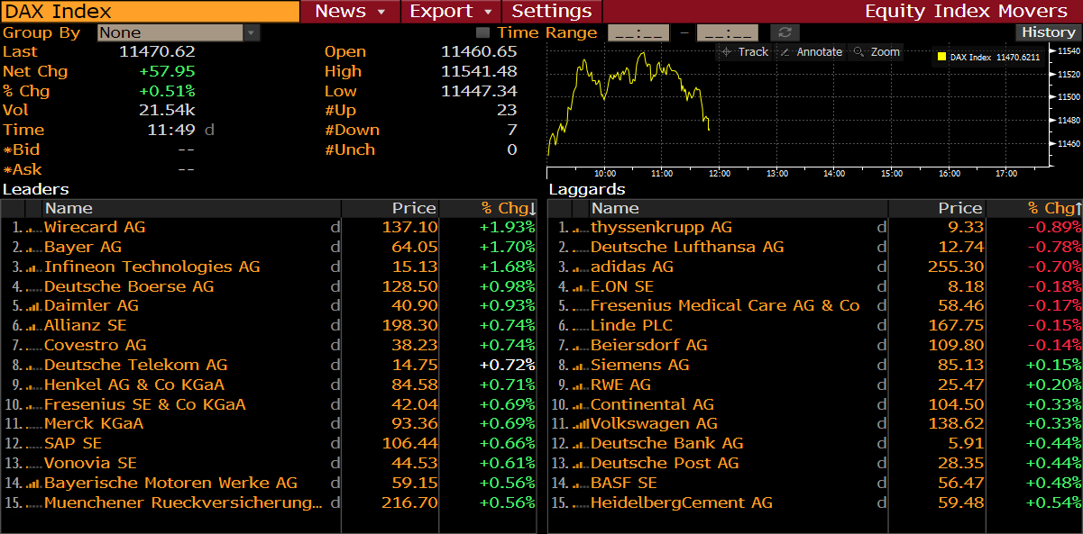 Infineon Technologies (IFX.DE) and Wirecard (WDI.DE) can be found among the best performing DAX stocks on Friday morning. Sentiment towards tech sector was boosted by the release of an upbeat earnings report from NVIDIA (NVDA.US). Applied Materials (AMAT.US), another US company from the semiconductor sector, also reported earnings yesterday and those came in-line with expectations. However, what seems to be the main reason behind good performance of the tech sector today is the fact that neither of the two companies decided to lower guidance for the second half of the year.