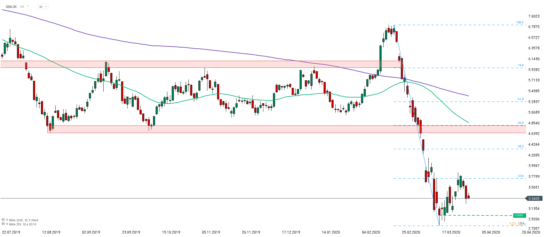 Commerzbank (CBK.DE) jumped over 35% from the low on March 16. However, the upward move was halted at 38.2% Fibo level of the February-March downward move. The key support to focus on right now is €3 mark. Source: xStation5