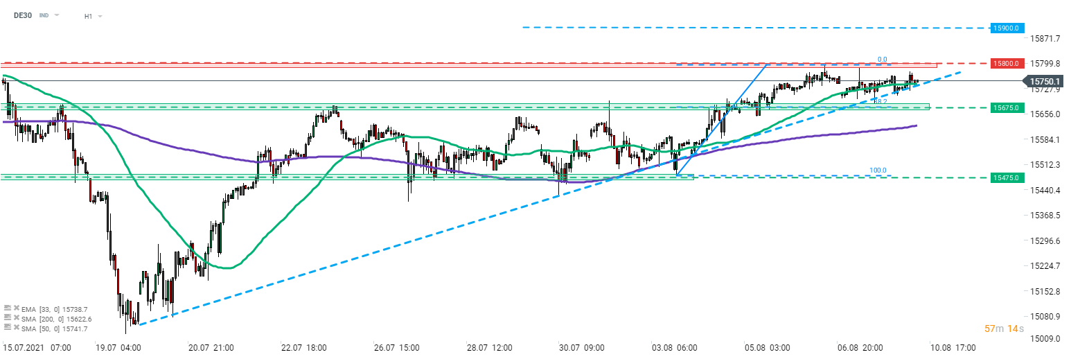 DE30 bounced off the support zone at 15,675 pts after a test yesterday. Index continues to trade within a striking distance of the all-time highs in 15,800 pts area. Weaker-than-expected ZEW reading did not have a major impact on stock markets. A test and a break to a fresh record highs cannot be ruled out in the later part of the day. In such a scenario the level to watch can be found at 15,900 pts - it is a potential range of the breakout from the July trading range.