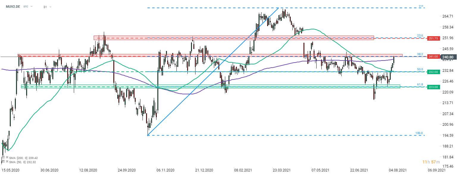 Munich Re (MUV2.DE) gains today following the release of a solid Q2 earnings report. Stock broke above the 200-session moving average (purple line) and is testing resistance zone at €241.00, marked with 38.2% retracement of the upward impulse launched in October 2020. Next resistance to watch in case of a break higher can be found at €251.75 and is marked with the 23.6% retracement. Source: xStation5