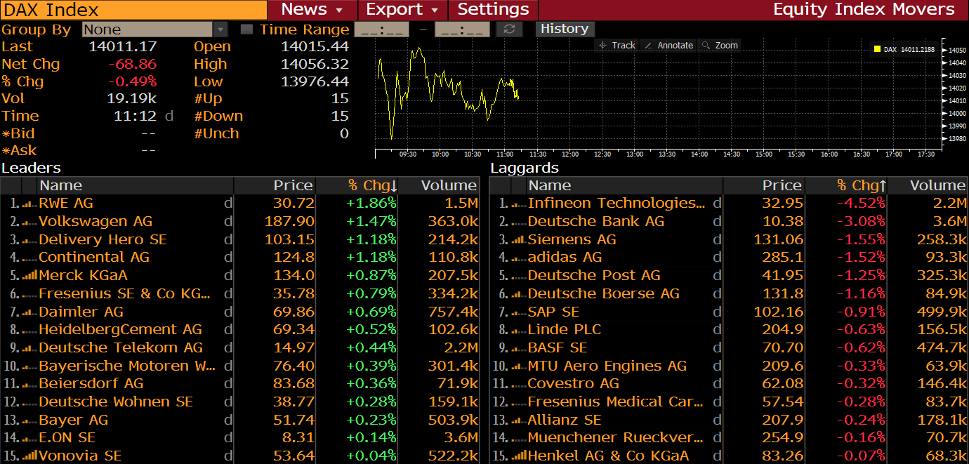 European indices are trading lower on Thursday but significantly above lows reached during the Asian session on the futures market. German DAX drops 0.7% while UK FTSE (UK100) and Dutch AEX (NED25) drop over 1%.