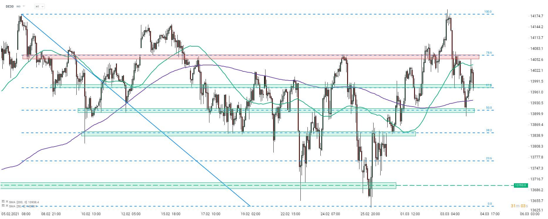 DE30 has managed to recover most of its overnight losses already. German index even managed to test a resistance zone marked by 78.6% retracement of February's correction at 14,060 pts. Nevertheless, DE30 failed to break above it and the price pulled back below the 50-hour moving average (green line). Index is testing short-term support at 61.8% retracement (13,975 pts). In case this support fails to halt sell-off, the way towards yesterday's lows near 50% retracement (13,900 pts will be left open). On the other hand, in case DE30 gets back on track and starts recovering, the resistance zone to watch is marked by the aforementioned 78.6% retracement.