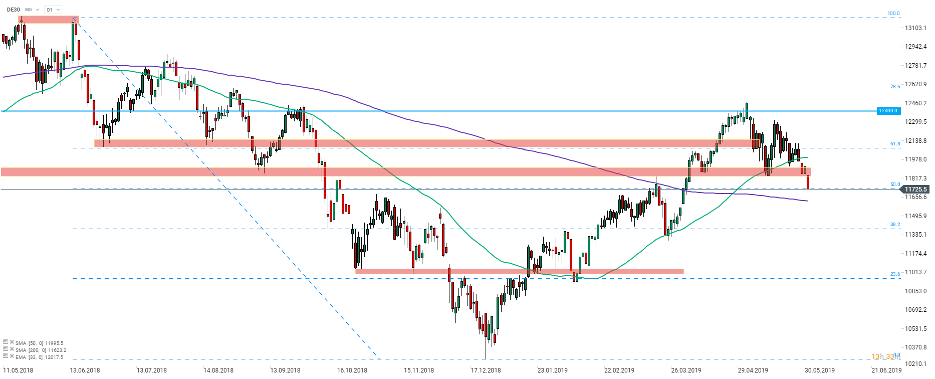 - DAX (DE30) pulls back towards 50% Fibo level of last year’s downward move
