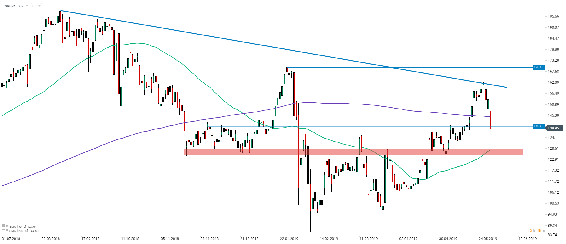 Wirecard (WDI.DE) took a dive below the 200-session moving average (purple line) this morning following release of Handelsblatt report. In case the pullback is to deepend, next support level in line could be €128 area where the upper limit of support zone and 50-session moving average is localized. Source: xStation5