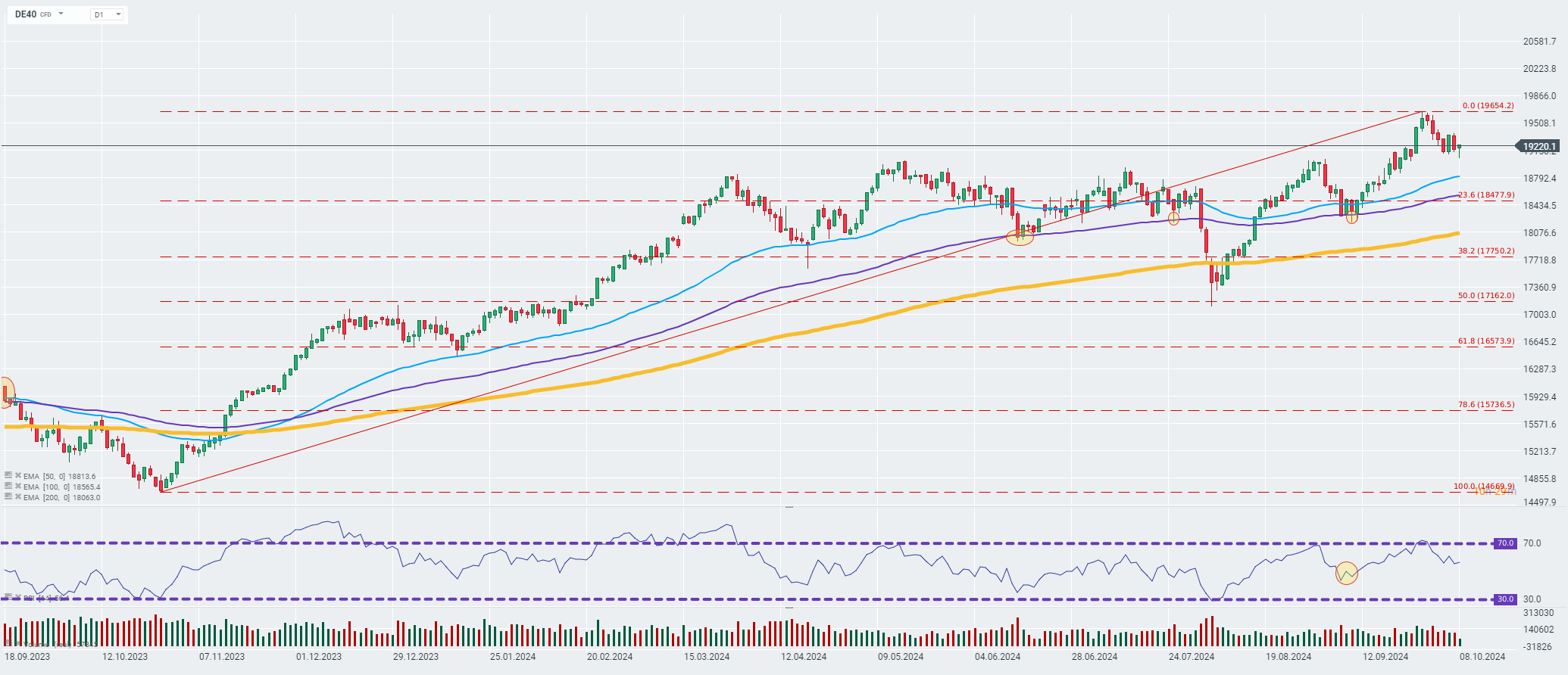 The German benchmark DE40 is trading close to 0.27% higher during Tuesday's session, despite the DAX losing on the cash market. It seems that the key support points for the broad upward trend remain the recent peak zones (19,000 points) and the 50-day EMA (blue curve on the chart). The most important resistance remains the historical peak close to 19,650 points. Source: xStation