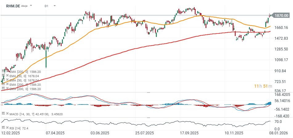 Rheinmetall has started a fresh leg higher, but the chart is also beginning to outline a potentially bearish head-and-shoulders formation, which could become relevant if the current move loses momentum.
