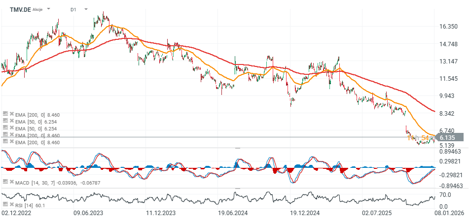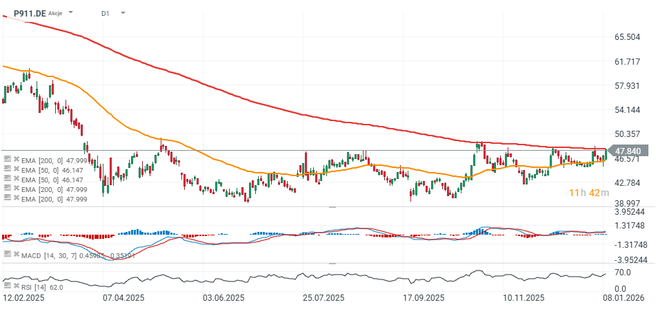 In short, Barclays’ message is that Porsche is still priced like a business with stable, high growth and a clear margin path, while the bank sees too many obstacles for that scenario to play out smoothly over the next few years. Despite the downgrade, the stock is rising strongly and approaching a test of the 200-period EMA (EMA200), suggesting growing pressure for a potential trend shift.