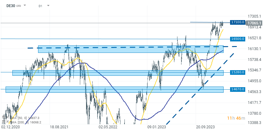 Despite modest gains on the DAX, the index is trading around historical highs at the level of 17,100 points. In the case of a deeper correction, it is worth observing the levels of 16,500 and 16,300, which are the nearest support zones.
