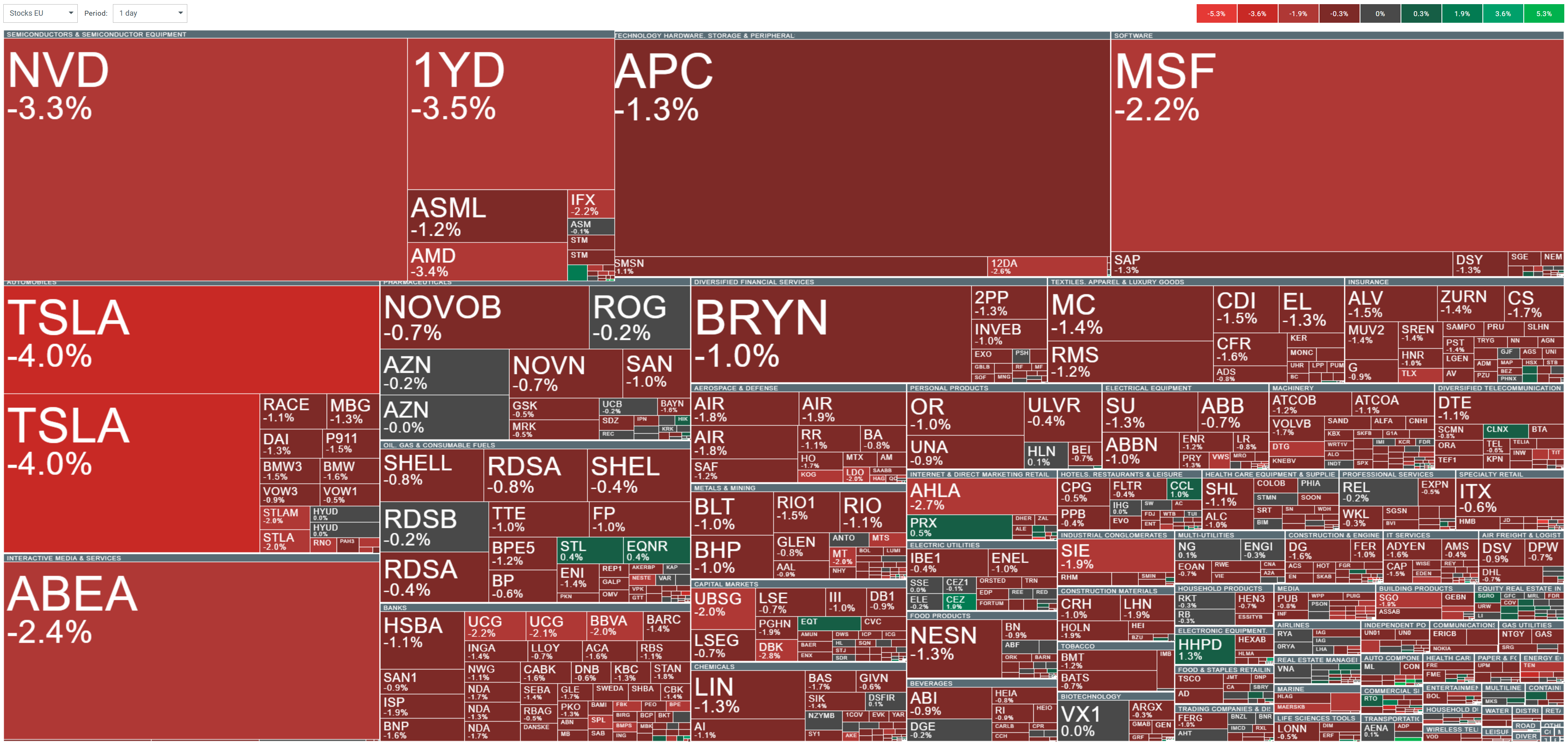 General market situation: European markets are trading lower across the board, with the Swiss SUI20 showing the steepest decline (-1.10%), followed by the Spanish SPA35 (-0.89%) and French FRA40 (-0.76%). The pan-European EU50 is down 0.49%, while the Italian ITA40 and Austrian AUT20 both declined 0.48%. The Dutch NED25 (-0.28%), UK's UK100 (-0.26%), and German DE40 (-0.15%) show more modest losses. The Polish W20 is the only index in positive territory, up 0.50%.