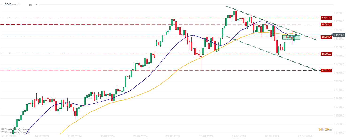 DAX contract (DE40) remains in consolidation at the end of the week. From broader perspective we see that the contract is still in the downward trend and still has problems with breaking out of resistant levels around 18394.4 pts. The French elections remain one of the reason putting pressure on European markets and if the uncertainty disappears, we might see potential break out towards 18400 pts level. However now the pressure remains strong and on top of that we see that the exponential moving average for 20-sessions (EMA20 - blue) is still traded below 50-sessions average (EMA50 - yellow), which usually means bearish signal. Source: xStation