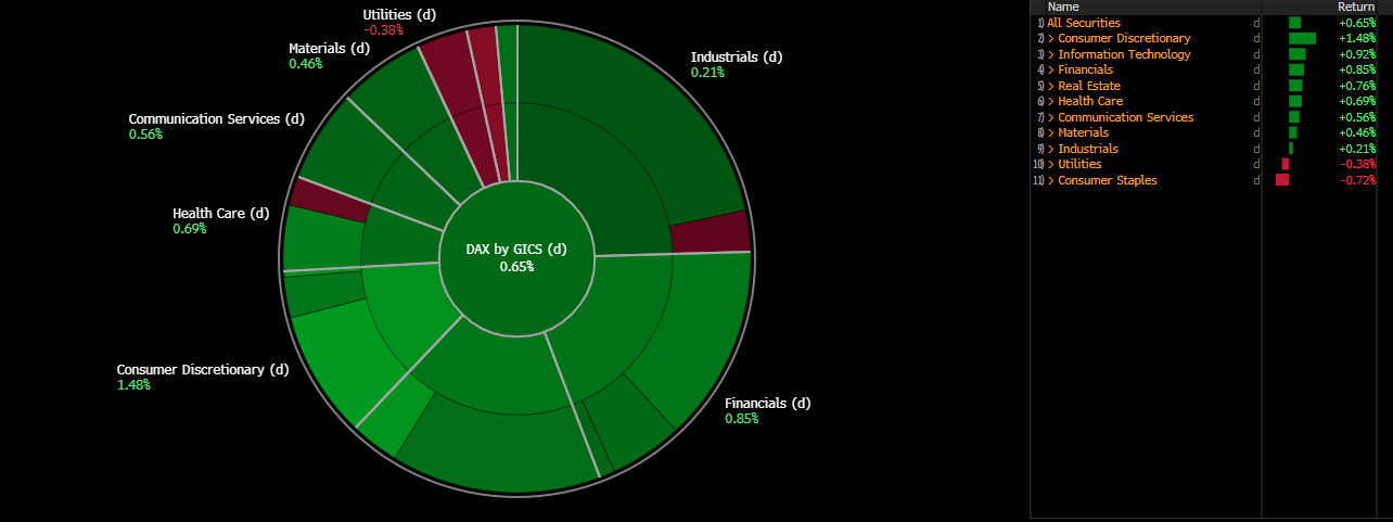 Strong performance of Consumer Discretionary sector combined with gains in Financials lets DAX remain its gains at the end of the second week in a row. Source: Bloomberg Finance L.P.