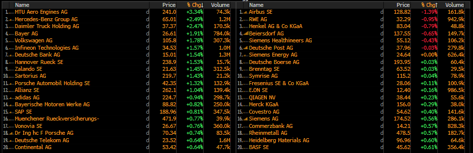 - Mercedes-Benz (MBG.DE) is gaining more than 2% today. The company announced an increase in its planned budget to improve combustion engine technology. The company also plans to facelift the engine of the flagship S-Class, which is expected to hit the market in mid-2026. Mercedes is also pushing back the vision of a complete shift to purely electric vehicles in the face of earlier announcements suggesting that the company will sell only electric cars by 2030. Currently, only an estimated 50% of vehicles sold will be electric.