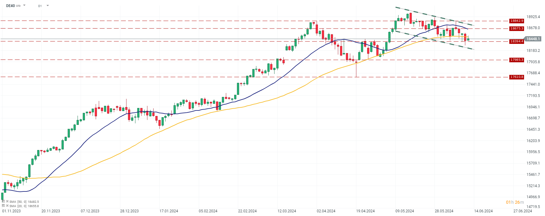 DAX's contract (DE40) declined yesterday under SMA50 level, coming closer to first important resistance level around 18394.4 pts. This is its main support in short-term corridor, which the contract has been following for the last two weeks. The downward break-out might increase bears' pressure, therefore leading the contract to further declines, following downward trend from the beginning of May. On the other hand, if positive momentum in today's session is held, bulls might observe the resistance level around 1867.3 pts. Breaking it might open the way to testing the corridor's resistance levels. However, with CPI coming up later this day, we do not see such a strong upward potential. Source: xStation