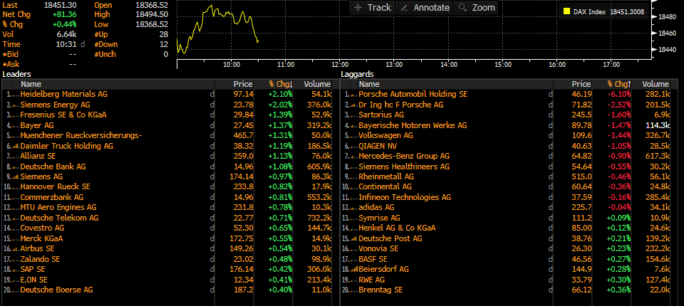 Siemens Energy continues positive momentum from yesterday gaining more than 2%. Financial institutions also support today's gains. Worst performing sector are carmakers, with overall decline over 0.7%. Source: Bloomberg Finance L.P.