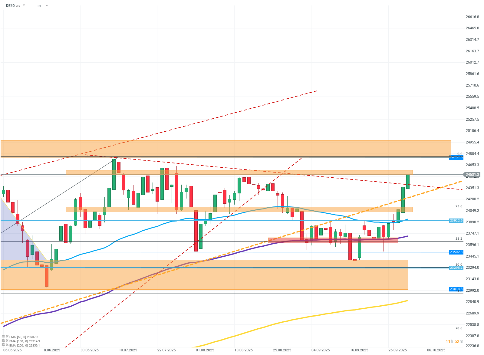 The chart shows that buyers have forcefully broken through the resistance zone at FIBO 23.6 and are currently halted at the last support zone separating the price from the ATH. Breaking the resistance around 24530 may result in testing the vicinity of the ATH, while bouncing off the resistance will most likely mean a return to consolidation between 24500 and 23500.