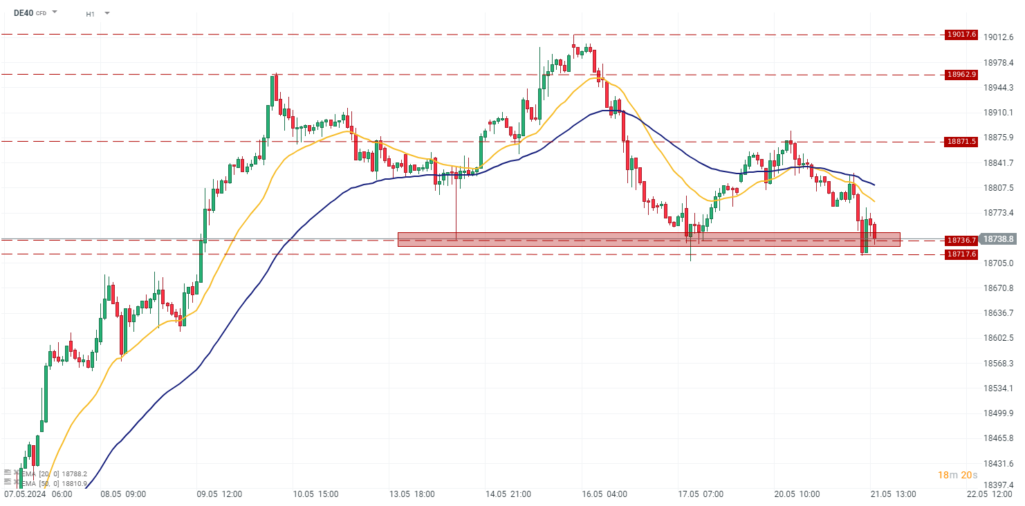 DAX index's contract (DE40) is currently traded near its short term support level between 18717-18736 pts. In previous sessions during May whenever it had reached those levels, we could see rebound coming back to growth. It is hard to predict whether today session will give opportunity to stronger gains, however probably tomorrow's Nvidia financial report might give enough strength for investors to push index back to higher quotation. On the other hand, worse than expected results might create a downward pressure. Source: xStation