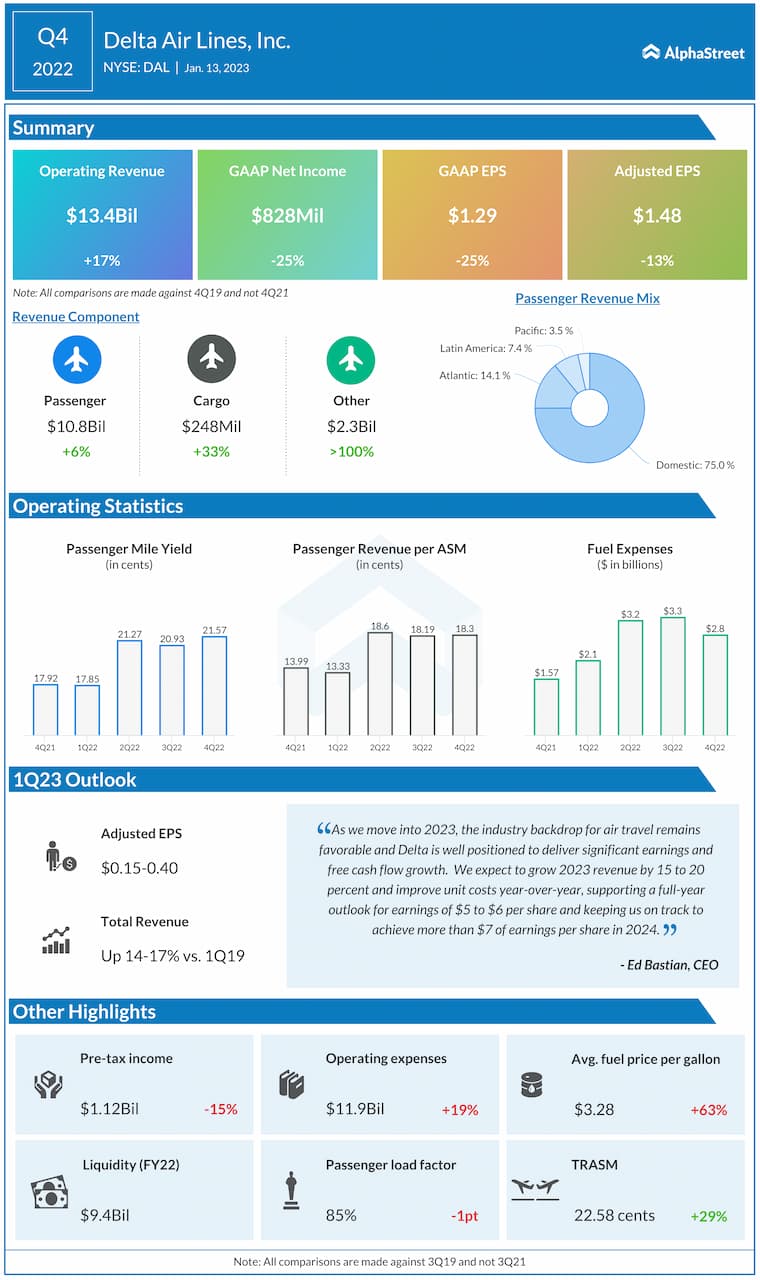 Delta Air Lines maintained an outlook for "significant" growth in 2023, including EPS of $5-$6 and free cash flow of more than $2 billion.