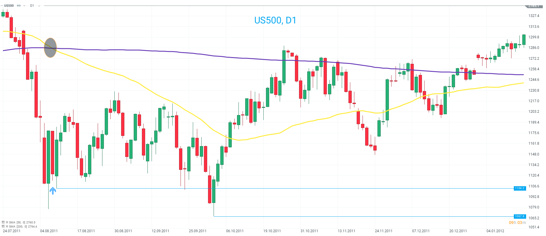 Death cross seen in US500 (50 SMA < 200 day SMA)