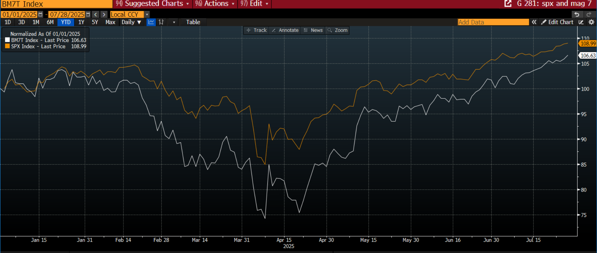 Chart 1: S&P 500 and the Magnificent 7, normalised to show how they move together YTD