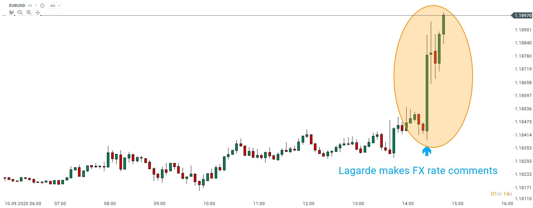 EURUSD jumped towards 1.19 after Lagarde said there is no need to overreact to euro gains. Source: xStation5