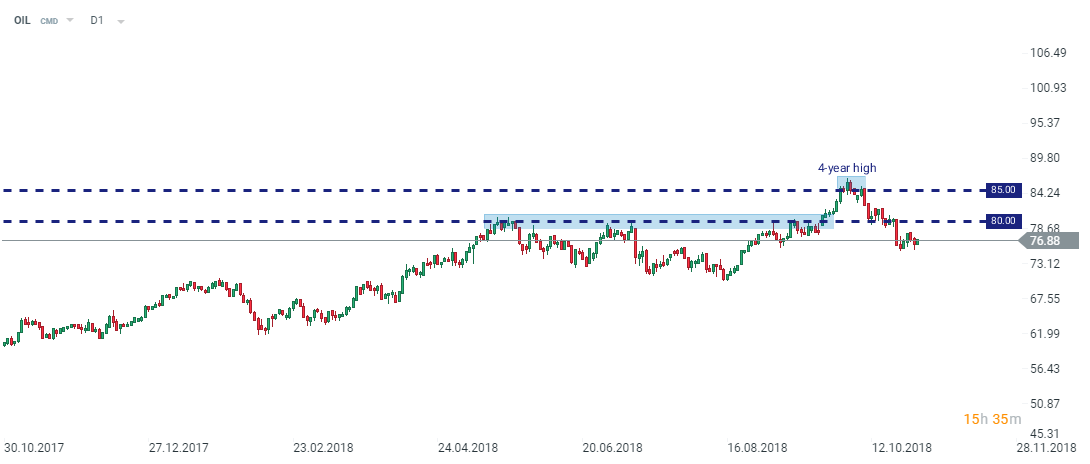 Brent (OIL on xStation5) continues its pullback from the multi-year high. However, the price action eased in the $75.50-77.00 area suggesting that another bulls’ attack cannot be ruled out. Source: xStation5