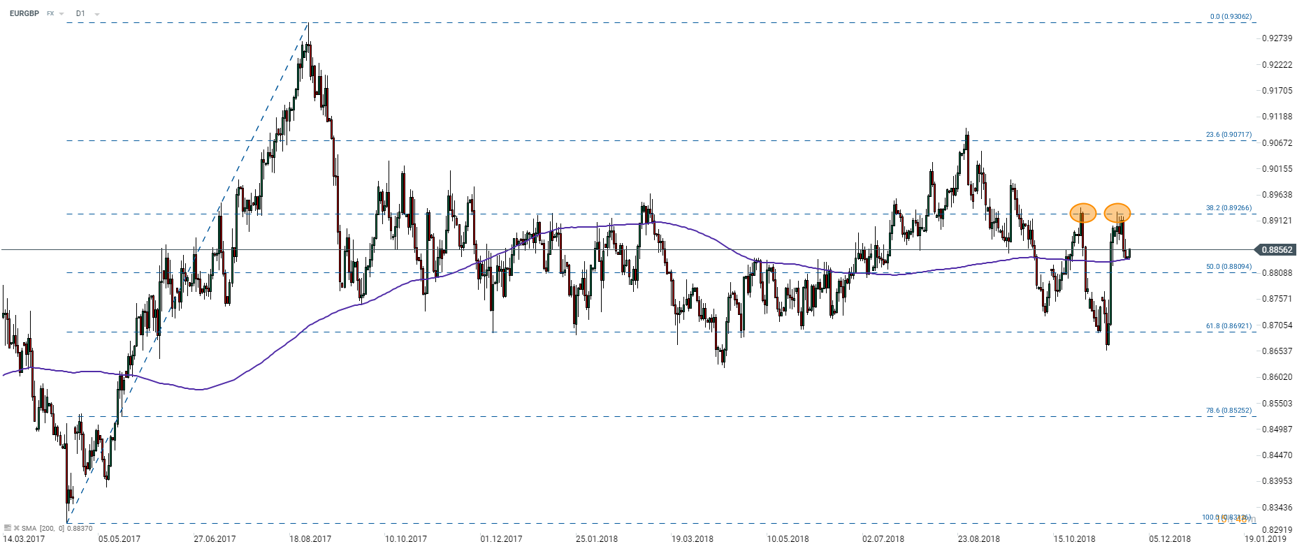 The latest steep surge on EURGBP was halted by the 38.2% Fibo level of the upward wave started in April 2017. The pullback reached the 200-session moving average and today’s speeches of Draghi and Carney may cause the pair to swing more wildly. Source: xStation5