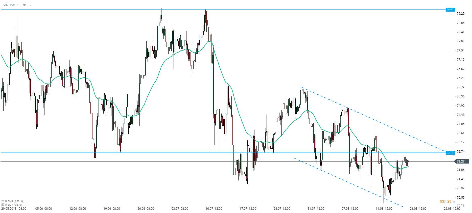 OIL price have fallen into the short-term downward price channel recently. Commodity bulls failed to break above the $72.70 handle yesterday but today’s data may allow them to perform another attack on this area. Source: xStation5
