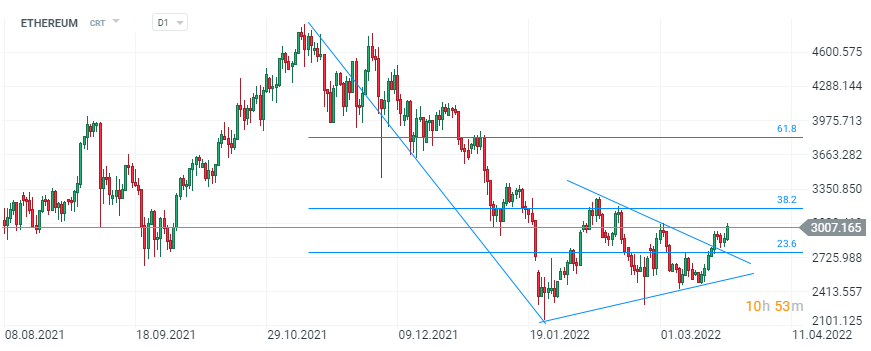 Ethereum, D1 interval. The price of the Ethereum has been moving in a downtrend since the fall of 2021. However, we are currently seeing a bullish breakout from the triangle formation. The price of ETH has recently tried several times to break the psychological resistance in the area of 3000 USD and 3200 USD, where the 38.2% retracement according to the Fibonacci measure is located. The nearest resistance for the growth of the cryptocurrency we can look for precisely at the level of 3200 USD, which coincides with the 38.2 retracement, in case of its defeat the road to 3900 USD seems to be open. Some investors may perceive exceeding 3000 USD as a short-term buy signal, which may help the demand side. At the same time, it is worth taking into account the correlation of the cryptocurrency market with the traditional stock exchange and the impact of geopolitical variables and macroeconomic factors on the market. Source: xStation 5