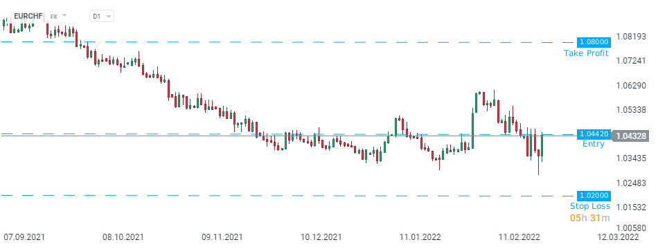 BofA recommends taking a long position on EURCHF at 1.0442 with a target of 1.0800 and stop loss order placed at 1.0200. Source: xStation5