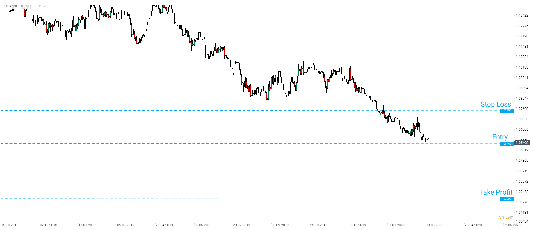JPMorgan recommends taking a short position on EURCHF at market price with a target of 1.0200 and a stop loss order placed at 1.0750. Source: xStation5