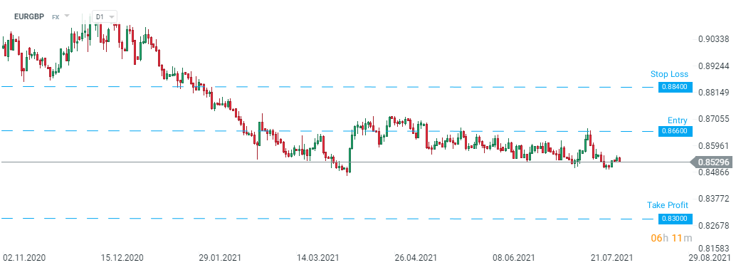 Citi recommends taking a short position on EURGBP at 0.8660 with a target of 0.8300 and a stop loss order placed at 0.8840. Source: xStation5