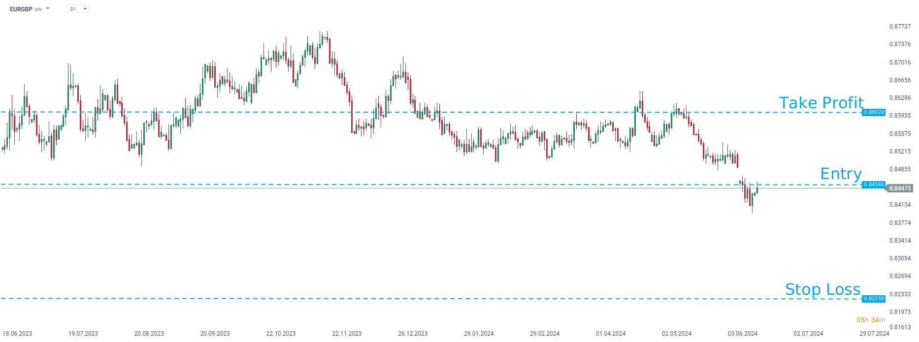Credit Agricole recommends taking a long position on EURGBP at market price with a target of 0.8456 and a stop loss order placed at 0.8225. Source: xStation5