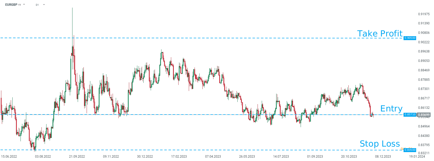 Danske Research recommends taking a long position on EURGBP at market price with a target of 0.9050 and a stop loss order placed at 0.8350. Source: xStation5
