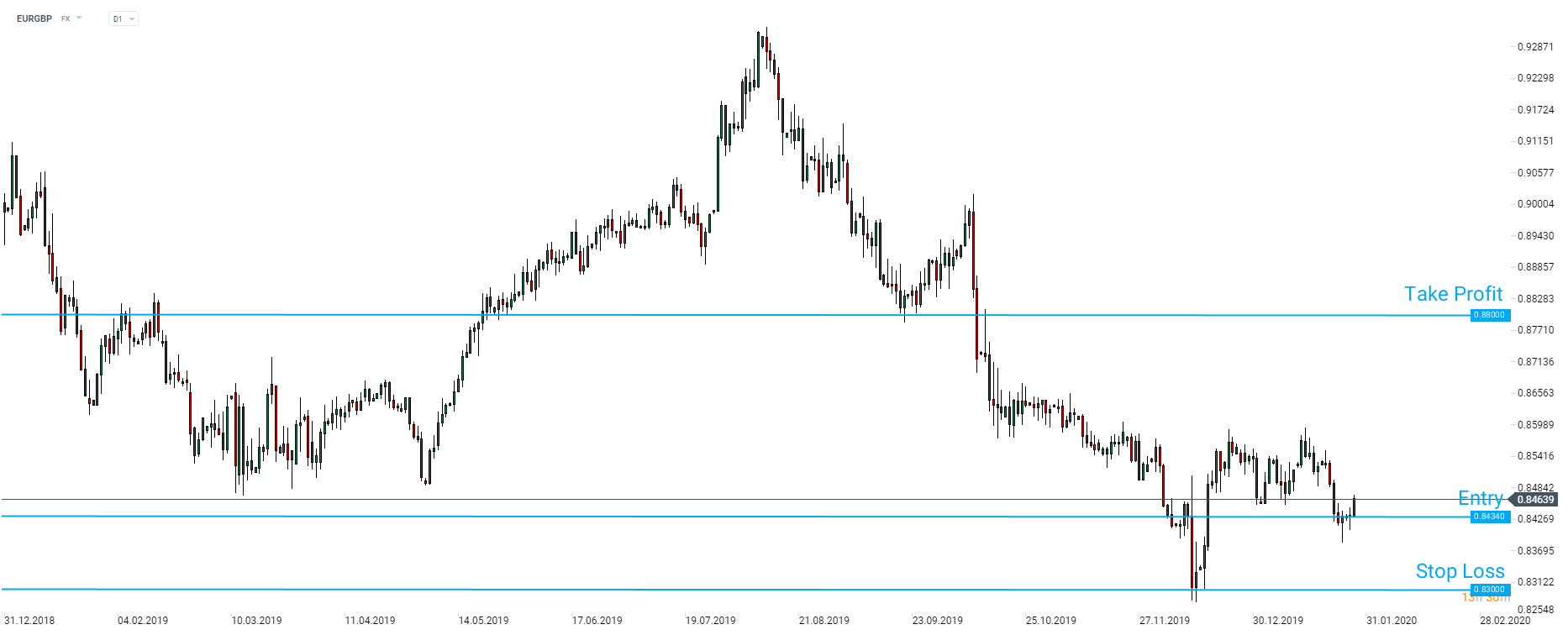 SEB Group recommends taking a long position on EURGBP at market price with a target of 0.8800 and a stop loss order placed at 0.8300. Source: xStation5