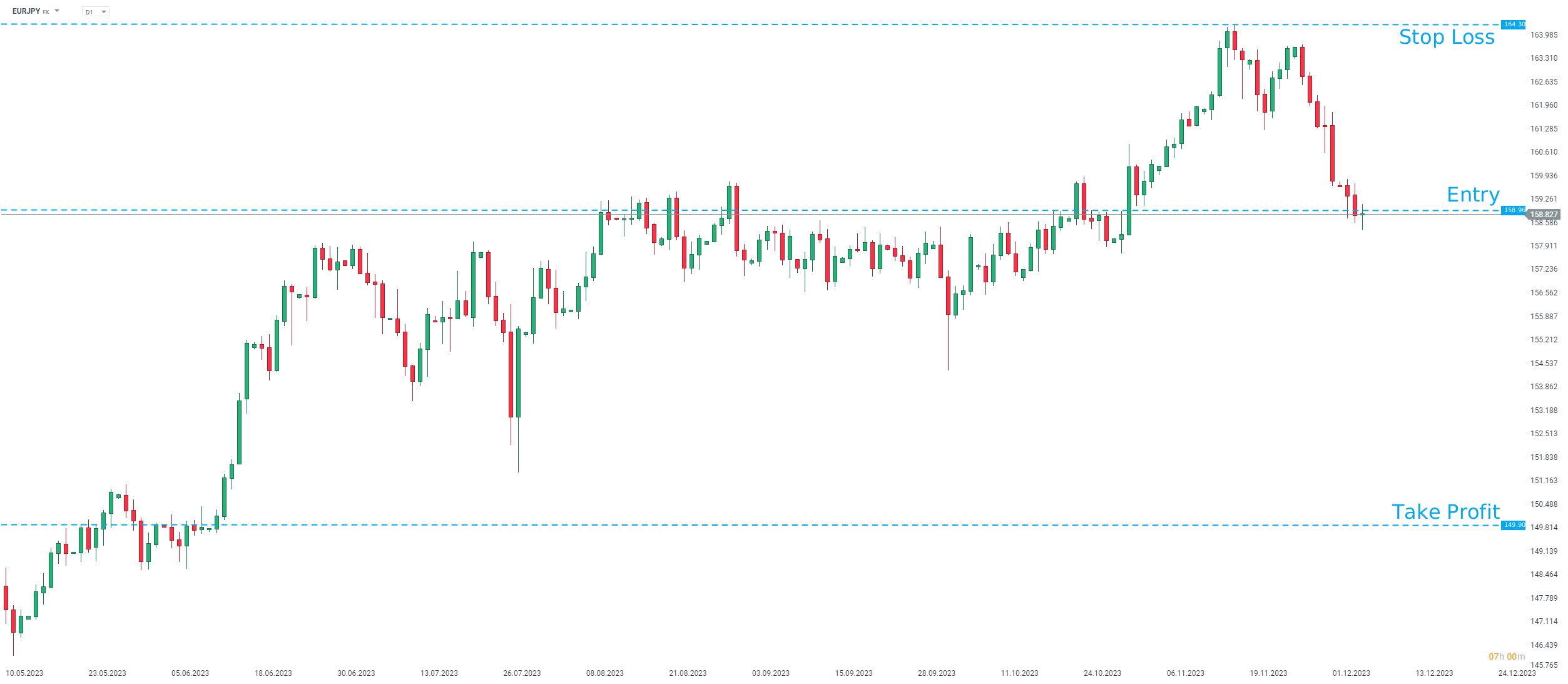 Danske Research recommends taking a short position on EURJPY at market price with a target of 149.90 and a stop loss order placed at 164.30. Source: xStation5