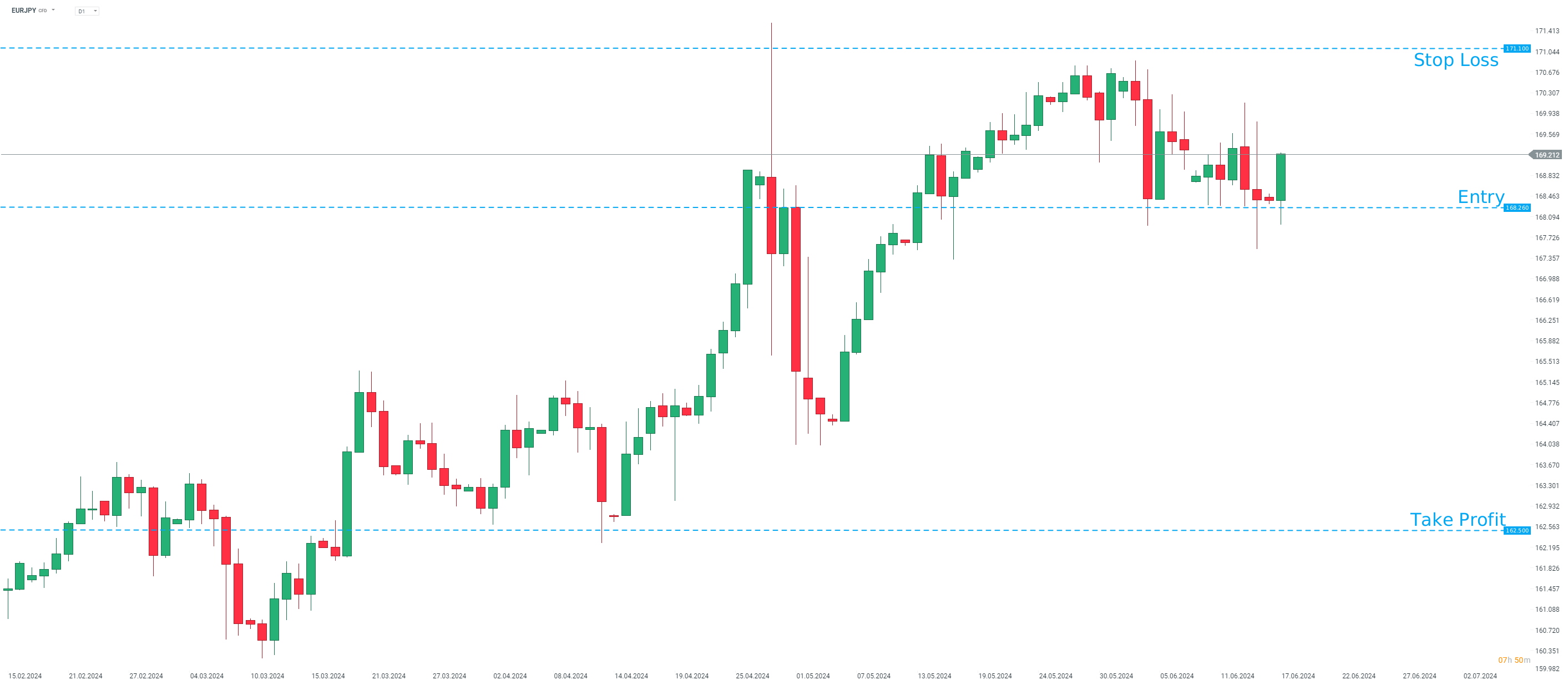 MUFG recommends taking a short position on EURJPY at market price with a target of 162.50 and a stop loss order placed at 171.10. Source: xStation5