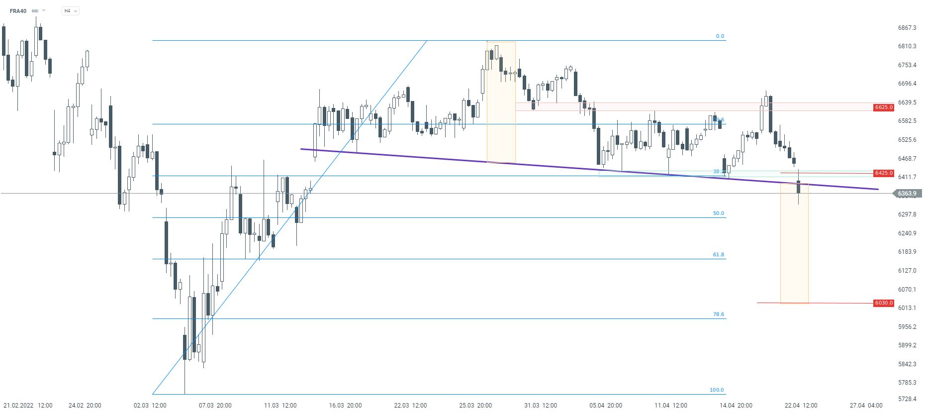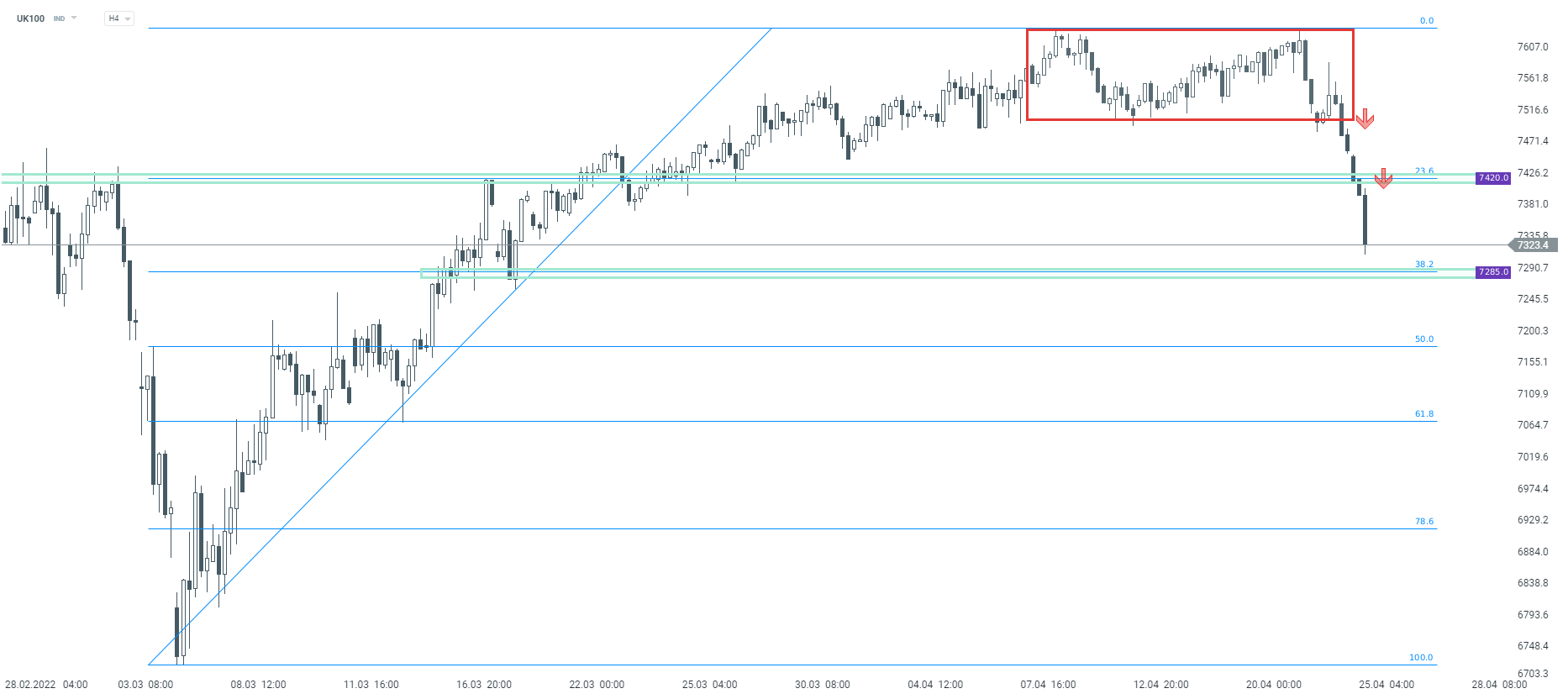 Last but not least, let's take a look at UK FTSE 100 index (UK100). Index delivered a downside breakout from a recent short-term trading range and with today's drop a textbook range of the breakout was executed. However, declines did not stop there and index continued to move lower. 7,285 pts support zone, marked with 38.2% retracement of the upward move launch in early-March is a key near-term support to watch for now.