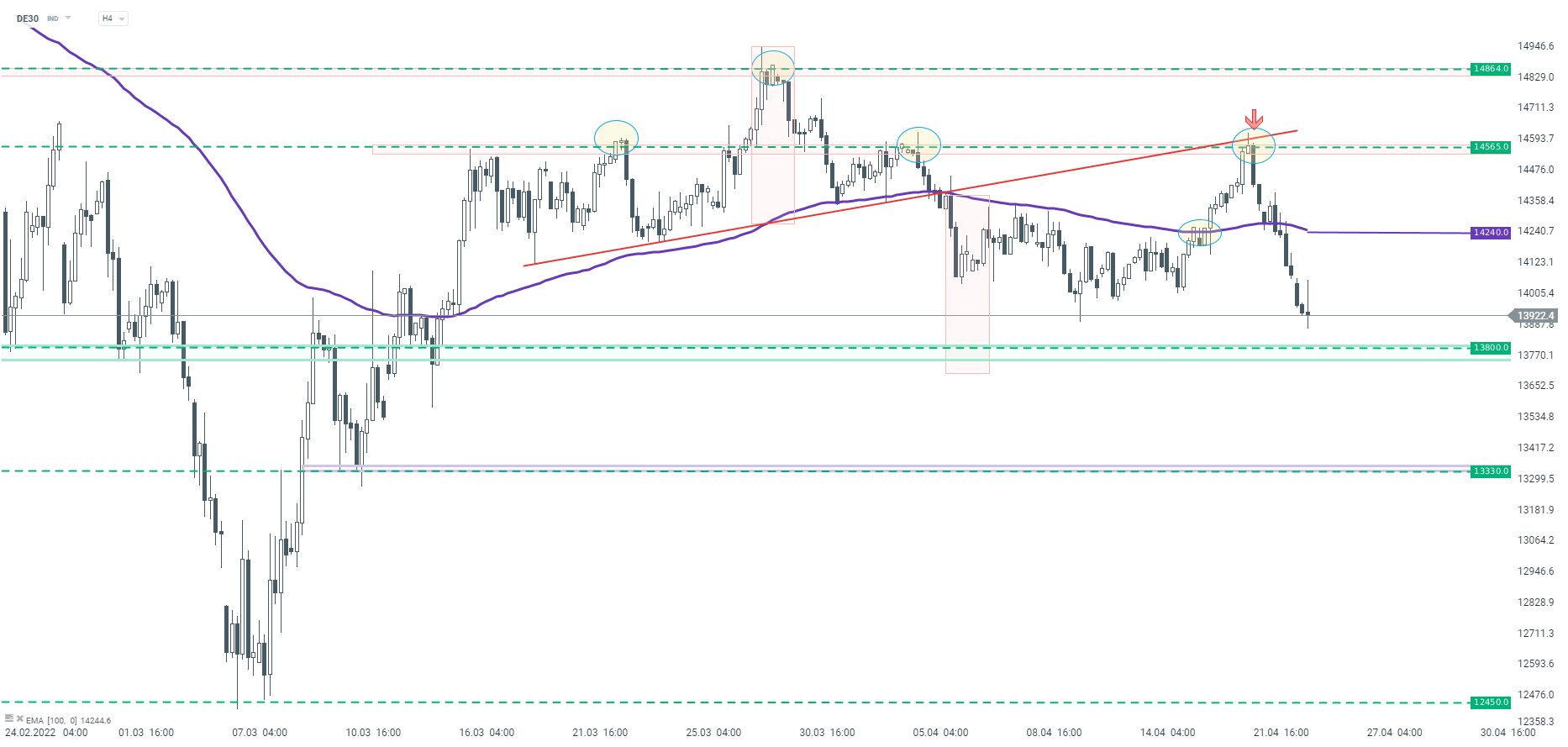 DE30 managed to break above 100-period EMA at H4 interval at the end of the previous week. However, advance was halted by the neckline of the previously broken head and shoulders pattern. Index resumed downward move and a drop towards the textbook range of the aforementioned pattern - 14,700 pts area - cannot be ruled out. Zone ranging below 13,800 pts may offer some support. However, a break below would pave the way for a drop to 13,330 pts support - the lowest level since early March.