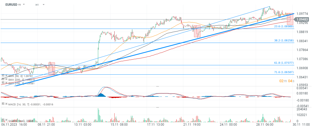 On H1 intreval we can see that EURUSD declines break out a pair from major trend line, and now we can possibly see testing support levels from SMA200 (red line). Falling below 1,09 may be a signal for testing even 1,08 levels.
