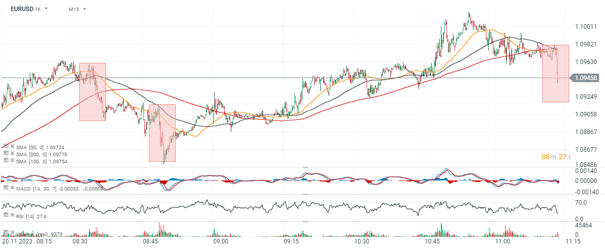 An unexpected American dollar rally and weaker than expected readings from France fueled weaker sentiments on EURUSD. Previously published stronger readings of Dutch ang Germany retail sales didn't support the European currency. The pair is already slipping more than 0.3%. At the same time, we don't see declines on TNOTE (an increase in yields), but instead the dollar index (USDIDX) is very clearly gaining. Therefore, it can be pointed out that this is partly a move on the euro, but mainly on the dollar.