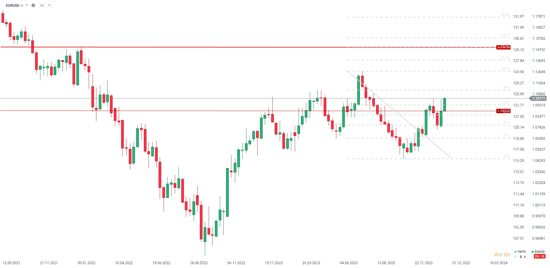 Money markets are pricing in an around-80% chance of Fed delivering the first rate cut as soon as at March 2024 meeting. However, should inflation data came in lower-than-expected, those dovish bets may increase further and may allow indices to continue to trade at record levels, and allow EURUSD to finish the year above 1.10.