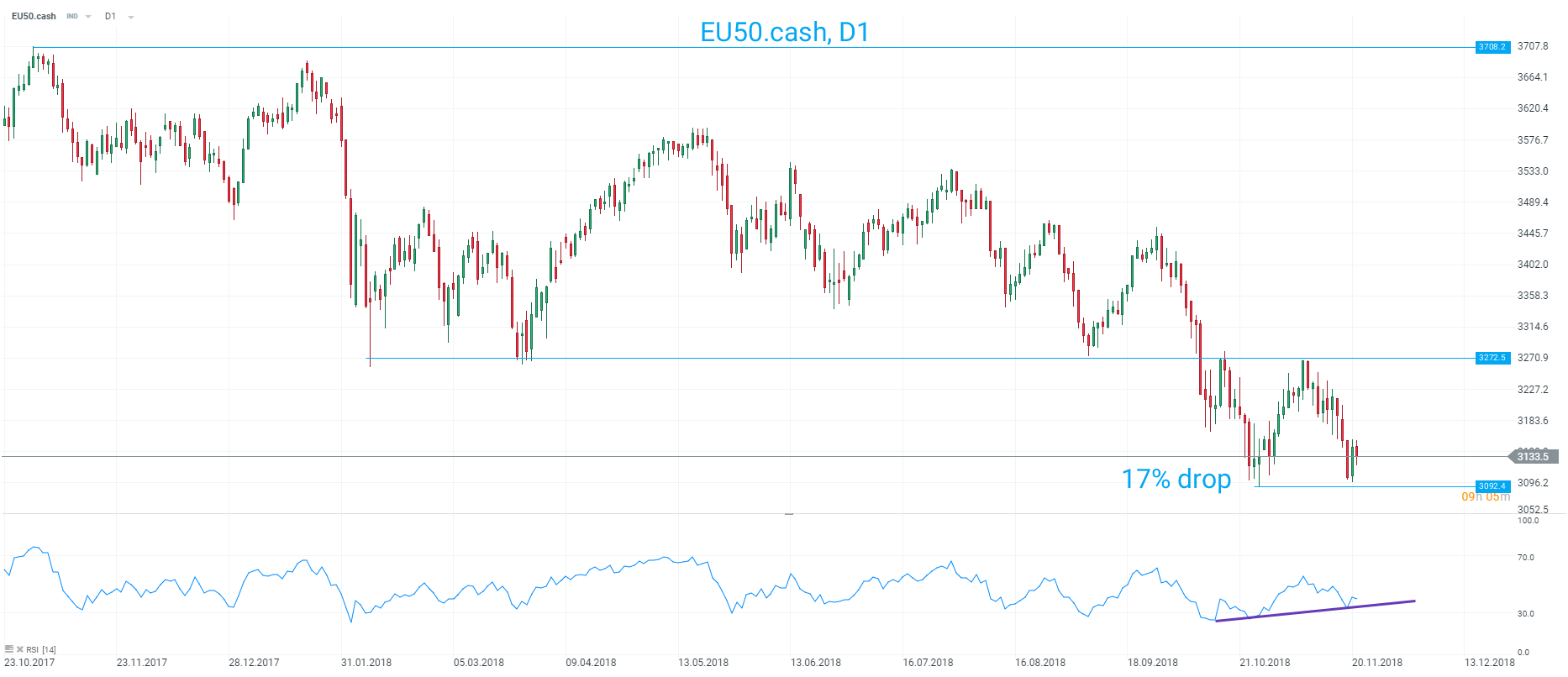 The EU50 is back near its recent lows of 3092, but a bounce yesterday along with some positive divergence in the RSI could be seen as suggesting a possible double bottom may be forming. Source: xStation