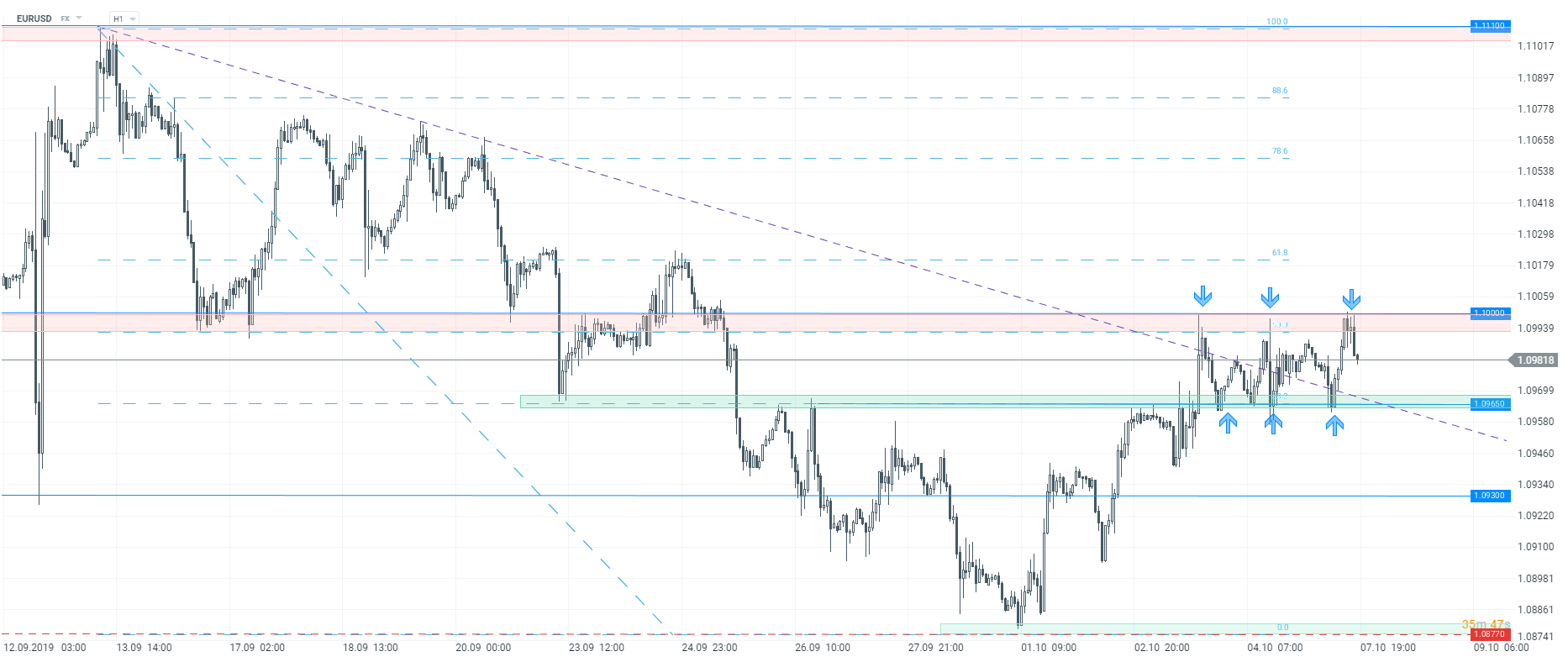 The EURUSD remains in range between the 1.10 and 1.0965, H1 interval. Source: xStation.