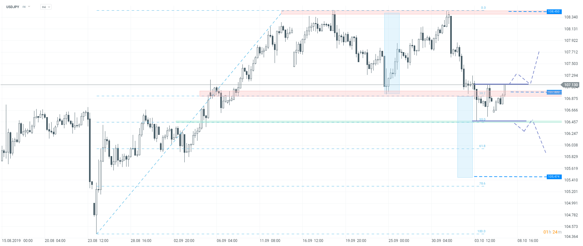 USDJPY fluctuates around a round level of 107.00. H4 interval. Source: xStation