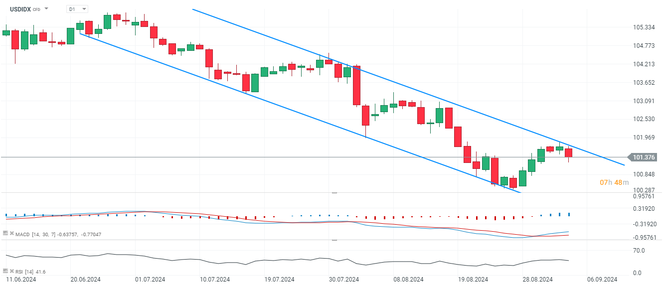 Since last rollover, futures on US Dollar index (USDIDX) dropped from 105 o almost 101 level. Overall, Bostic signals a 25 bps rate cut as more probable.